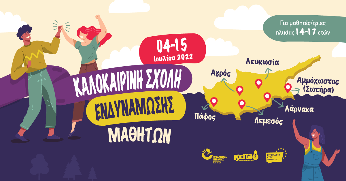 Τα Κέντρα Πληροφόρησης Νέων του Οργανισμού Νεολαίας Κύπρου ανακοινώνουν με ιδιαίτερη χαρά τη διοργάνωση της ετήσιας Καλοκαιρινής Σχολής Ενδυνάμωσης Μαθητών για 7η συνεχόμενη χρονιά. Φέτος, μετά τα δυο τελευταία χρόνια που η Καλοκαιρινή Σχολή είχε υλοποιηθεί διαδικτυακά, είμαστε έτοιμοι να υποδεχτούμε τους νέους και τις νέες στους χώρους μας σε όλη την Κύπρο. Η Καλοκαιρινή Σχολή Ενδυνάμωσης Μαθητών θα πραγματοποιηθεί από τις 04 Ιουλίου μέχρι τις 15 Ιουλίου 2022 με φυσική παρουσία σε όλα τα Κέντρα Πληροφόρησης Νέων Παγκύπρια και εντάσσεται στο πλαίσιο των εκδηλώσεων του Οργανισμού Νεολαίας Κύπρου για το Ευρωπαϊκό Έτος Νεολαίας 2022.