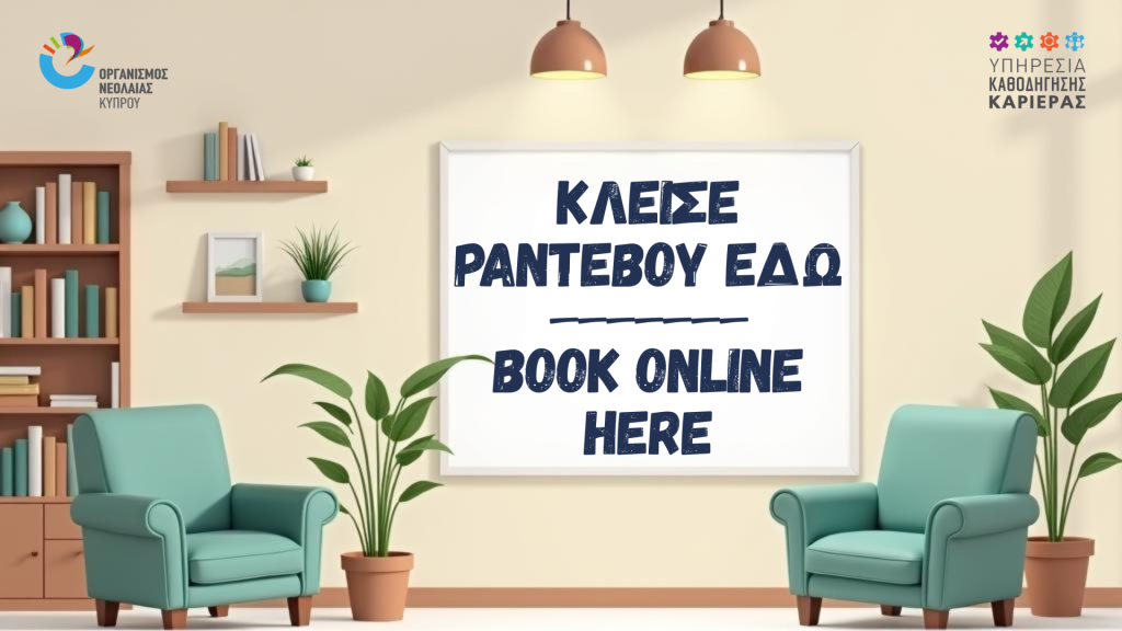 Ο/η κάθε νέος/-α μπορεί να διευθετήσει προσωπικό ραντεβού με Σύμβουλό μας έτσι ώστε να λάβει εξατομικευμένη συμβουλευτική καθοδήγηση είτε σε θέματα Επαγγελματικού Προσανατολισμού, είτε σε θέματα Νεανικής Επιχειρηματικότητας. Τα ραντεβού πραγματοποιούνται στα Πολύκεντρα του Οργανισμού Νεολαίας σε όλες τις επαρχίες.